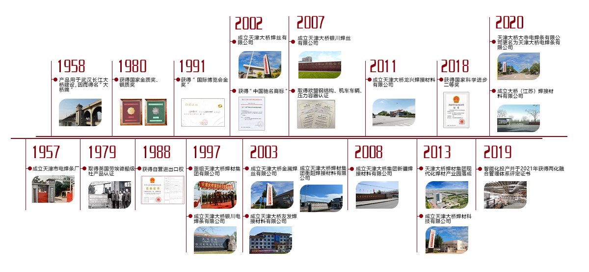 天津市電焊條廠(chǎng)創(chuàng)建于1957年。1958年,共和國(guó)橫跨長(zhǎng)江的第一座大橋——武漢長(zhǎng)江大橋選用天津市電焊條廠(chǎng)焊材,這是國(guó)產(chǎn)焊條首次應(yīng)用在國(guó)家重點(diǎn)工程中,“大橋牌”由此誕生。1997年,天津市鈦鐵實(shí)業(yè)總公司與天津市電焊條廠(chǎng)實(shí)行股份制重組,正式創(chuàng)立天津大橋焊材集團(tuán)有限公司。
